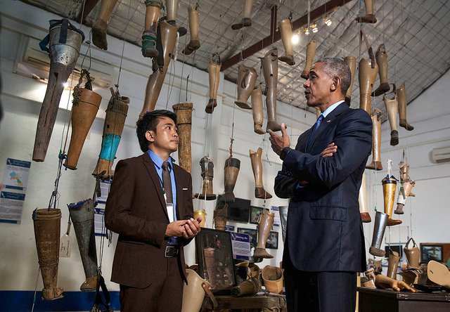 In this surreal photo, Obama visits the Cooperative Orthotic Prosthetic Enterprise in Laos, to acquire nearly the toll mines have had on the region.