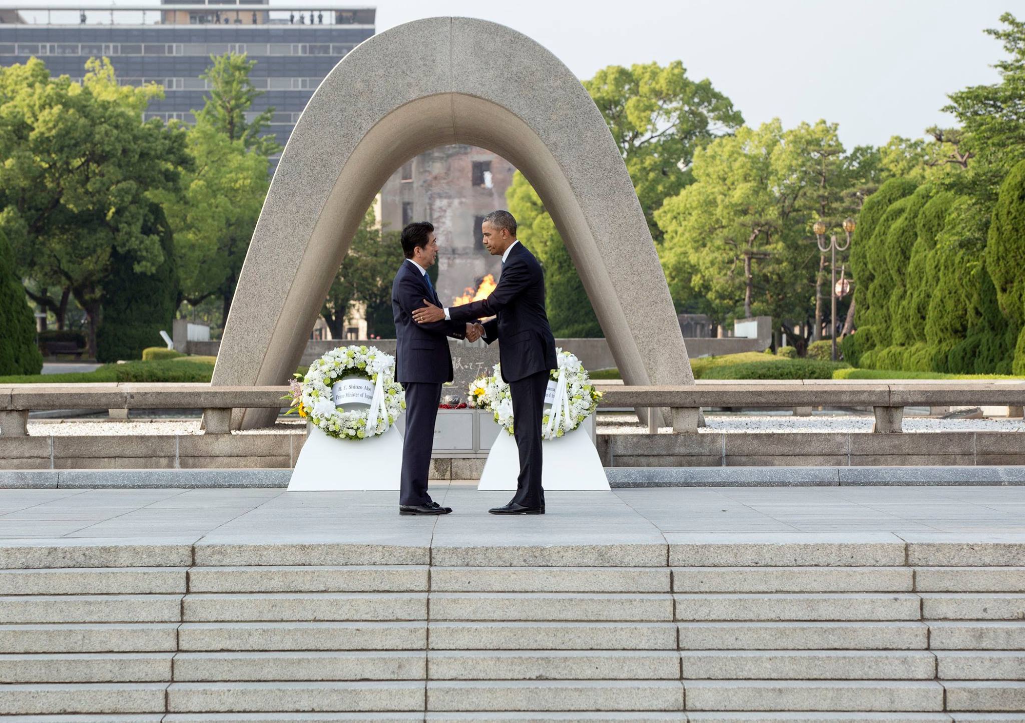 Obama shakes hands with Japanese President Shinzo Abe during a visit to the Hiroshima Memorial in Japan in May 2016, the first e'er by a US president. Abe, in a as well symbolic visit, came to Pearl Harbor in December of the same twelvemonth, becoming the quaternary Japanese president to exercise and so.